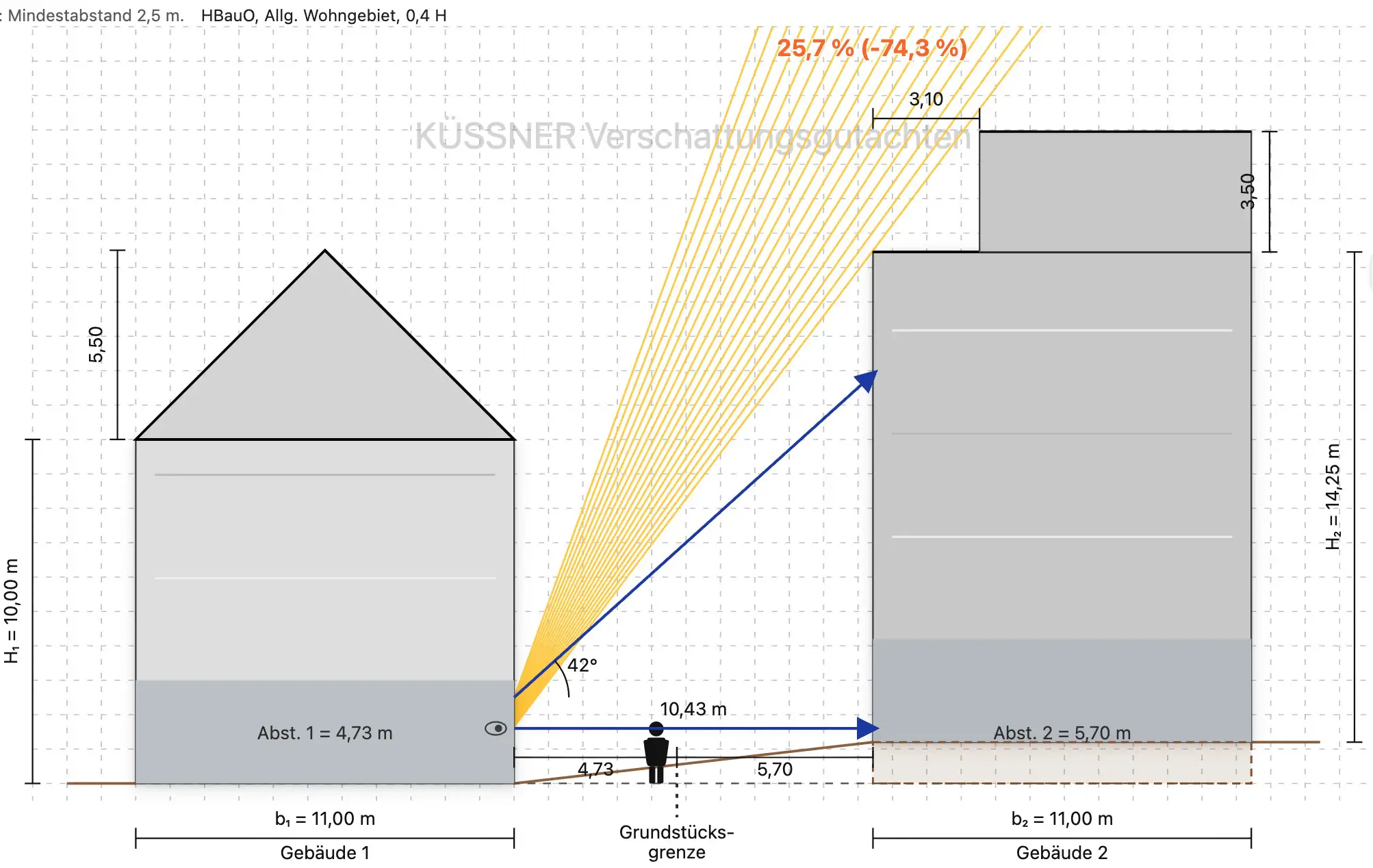 Wenn Sie zusätzlich prüfen möchten, ob die bauordnungsrechtlichen Abstandsflächen eingehalten werden, empfehlen wir unser zweites kostenloses Online-Werkzeug: www.abstandsflaechenrechner.de